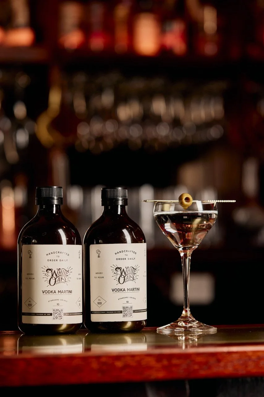 In response to growing demand for enjoying these unique spirits at home, we launched The White Oaks Dispensary in 2020 — a curated collection of made-to-order bottled cocktails. Each month, we offer a new selection designed to guide you through the rich legacy and vibrant current trends of the cocktail world, all crafted with care by our expert team.